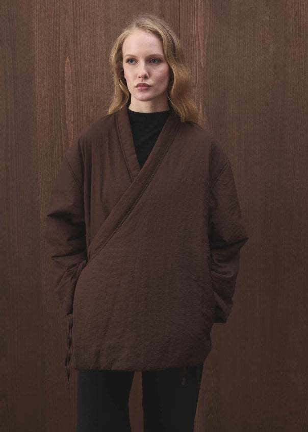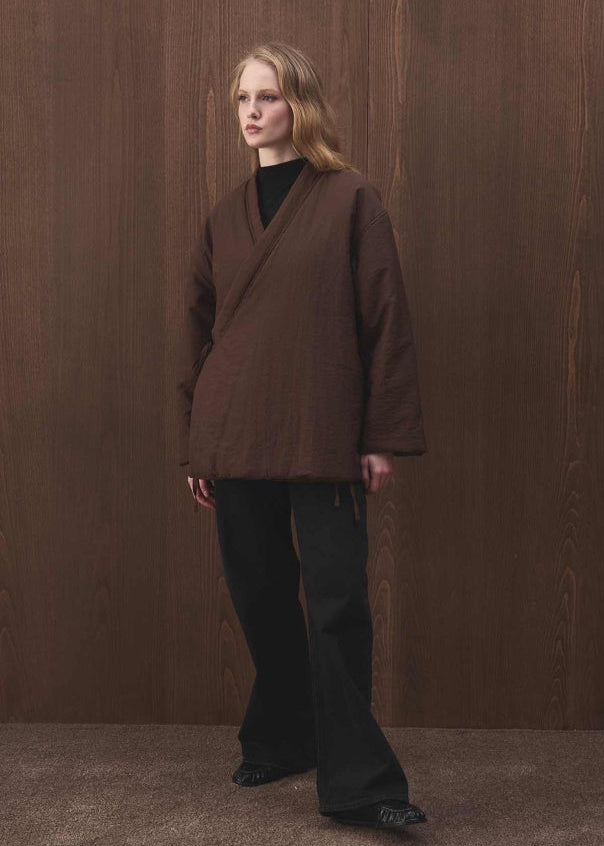 Kimono yakalı, bağlama detaylı, düşük omuz, gizli cep detaylı, rahat kalıp, astarsız anvelop bağlama şişme mont. Hafif dokusu sayesinde konforlu bir kullanım sunarken, anvelop formu ve yan bağlama detayı ile özgün bir siluet oluşturur.
