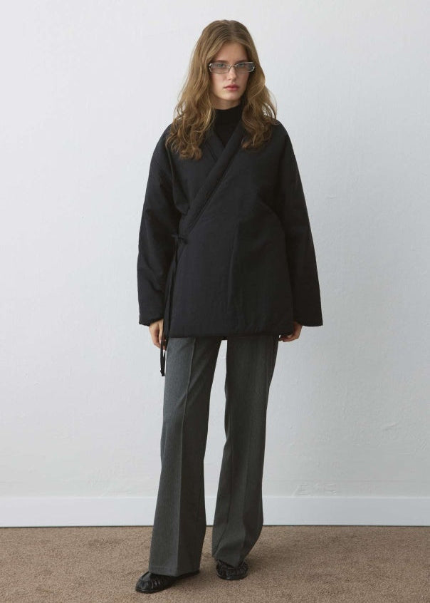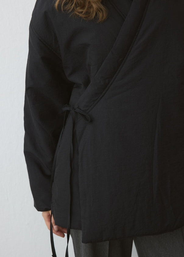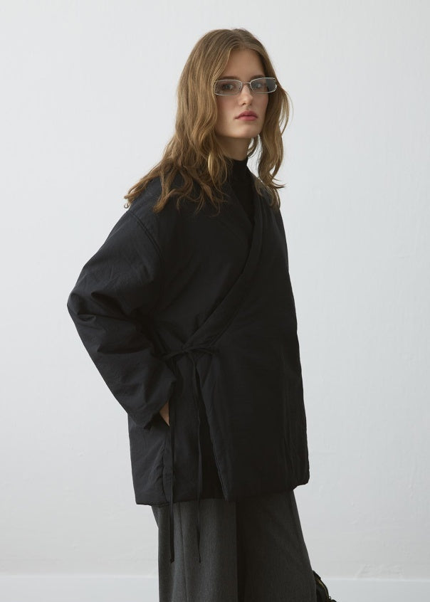 Kimono yakalı, bağlama detaylı, düşük omuz, gizli cep detaylı, rahat kalıp, astarsız anvelop bağlama şişme mont. Hafif dokusu sayesinde konforlu bir kullanım sunarken, anvelop formu ve yan bağlama detayı ile özgün bir siluet oluşturur.