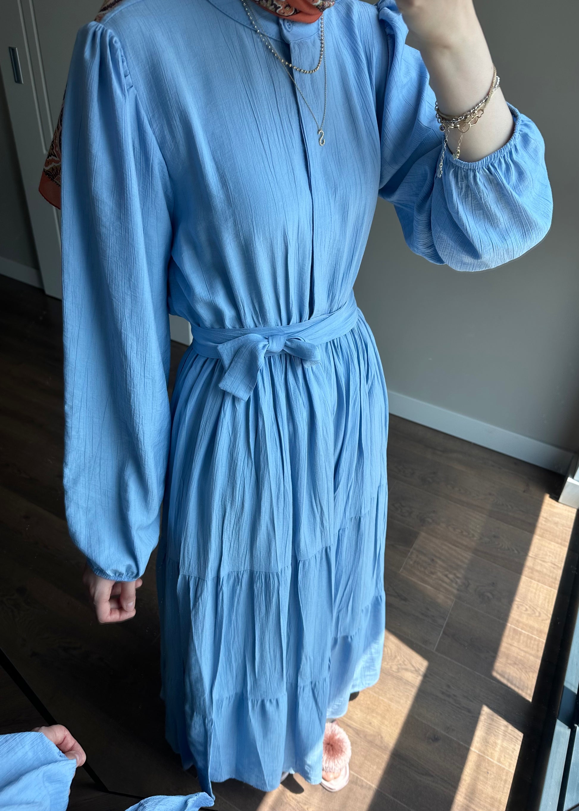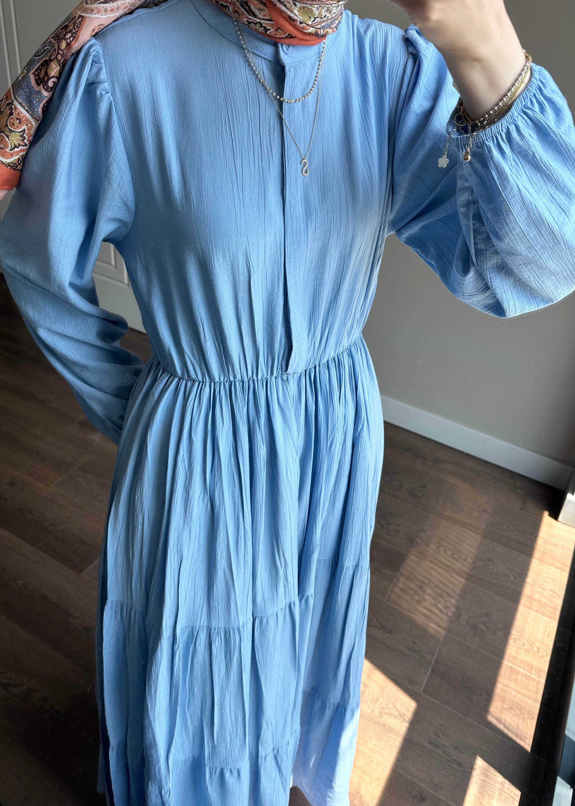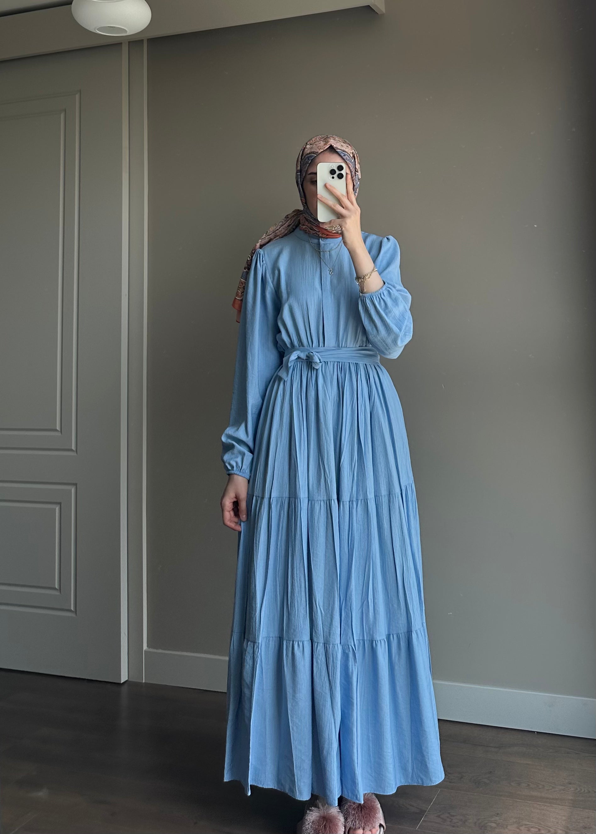 Dokuma çilek kumaş , beli lastikli , kuşaklı , bisiklet yakalı , kat kat , bele kadar düğmeli elbise. Kırışma yapmaz , yazlıktır.