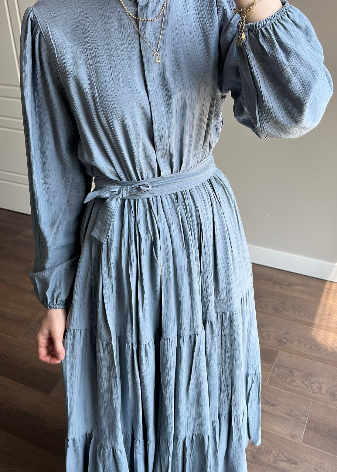 Dokuma çilek kumaş , beli lastikli , kuşaklı , bisiklet yakalı , kat kat , bele kadar düğmeli elbise. Kırışma yapmaz , yazlıktır.