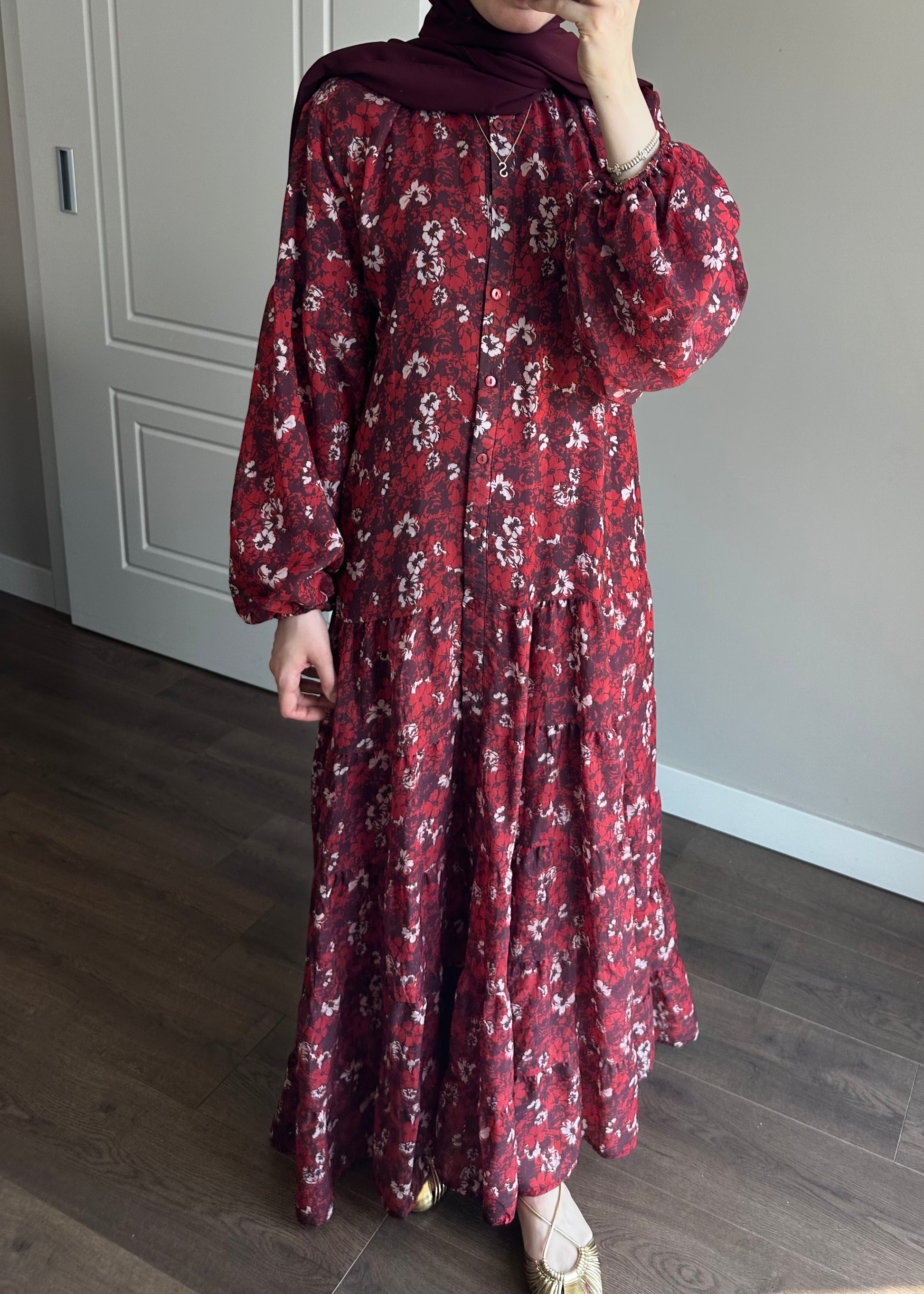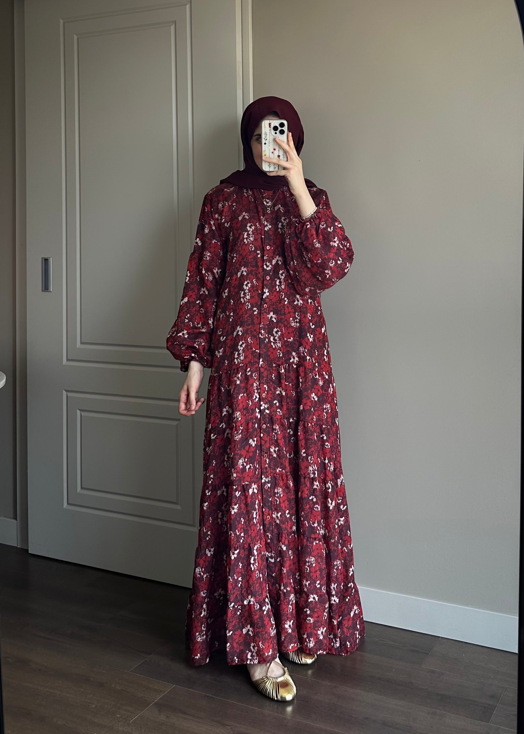 ÇİÇEK DESENLİ VUAL ELBİSE BORDO