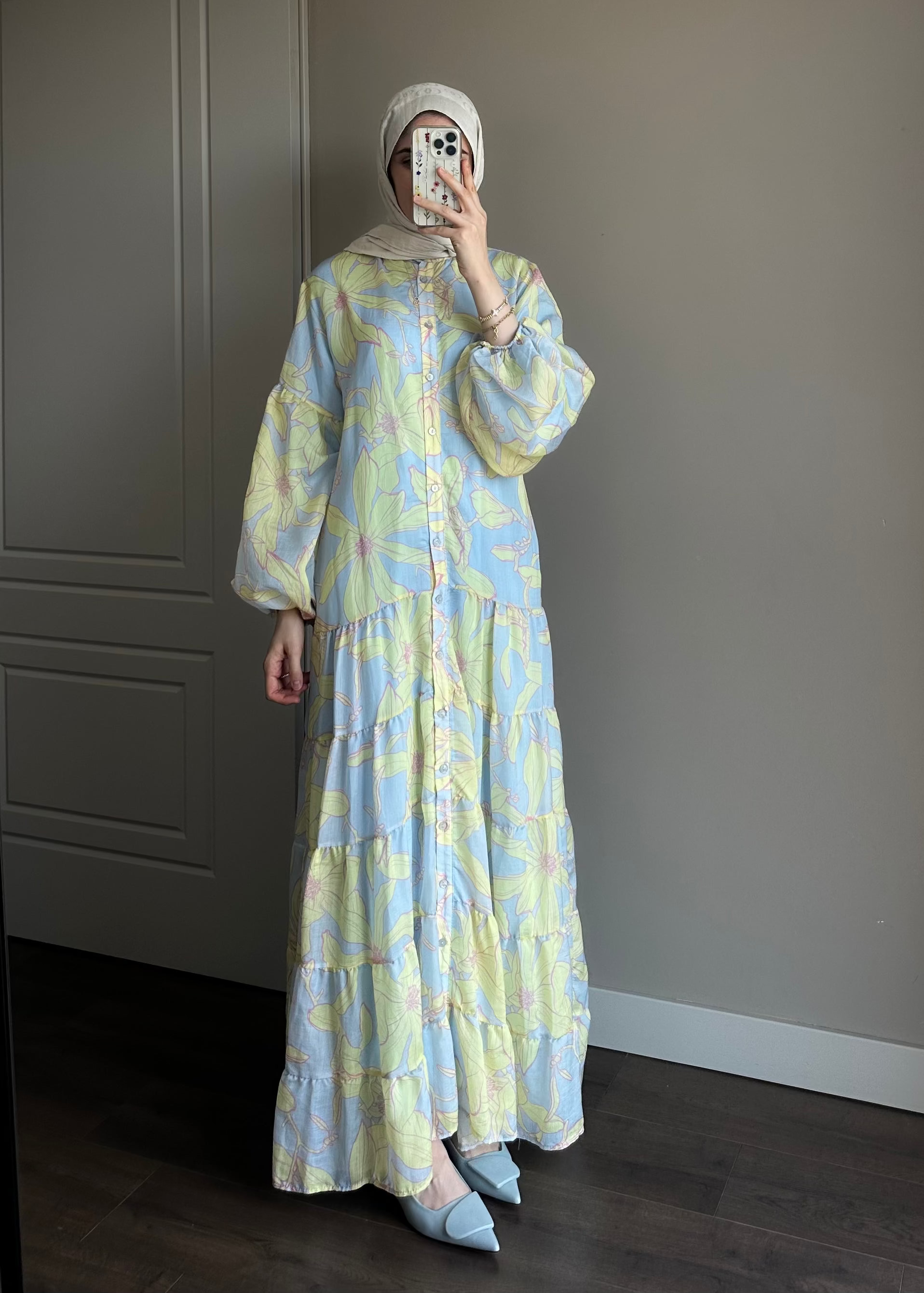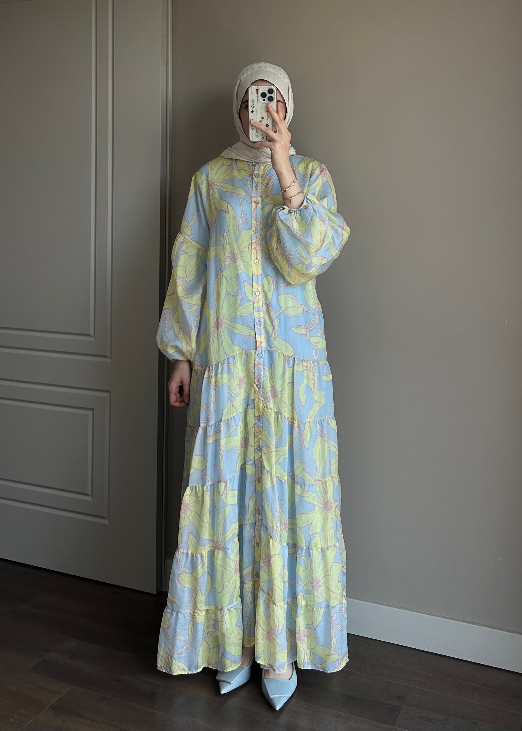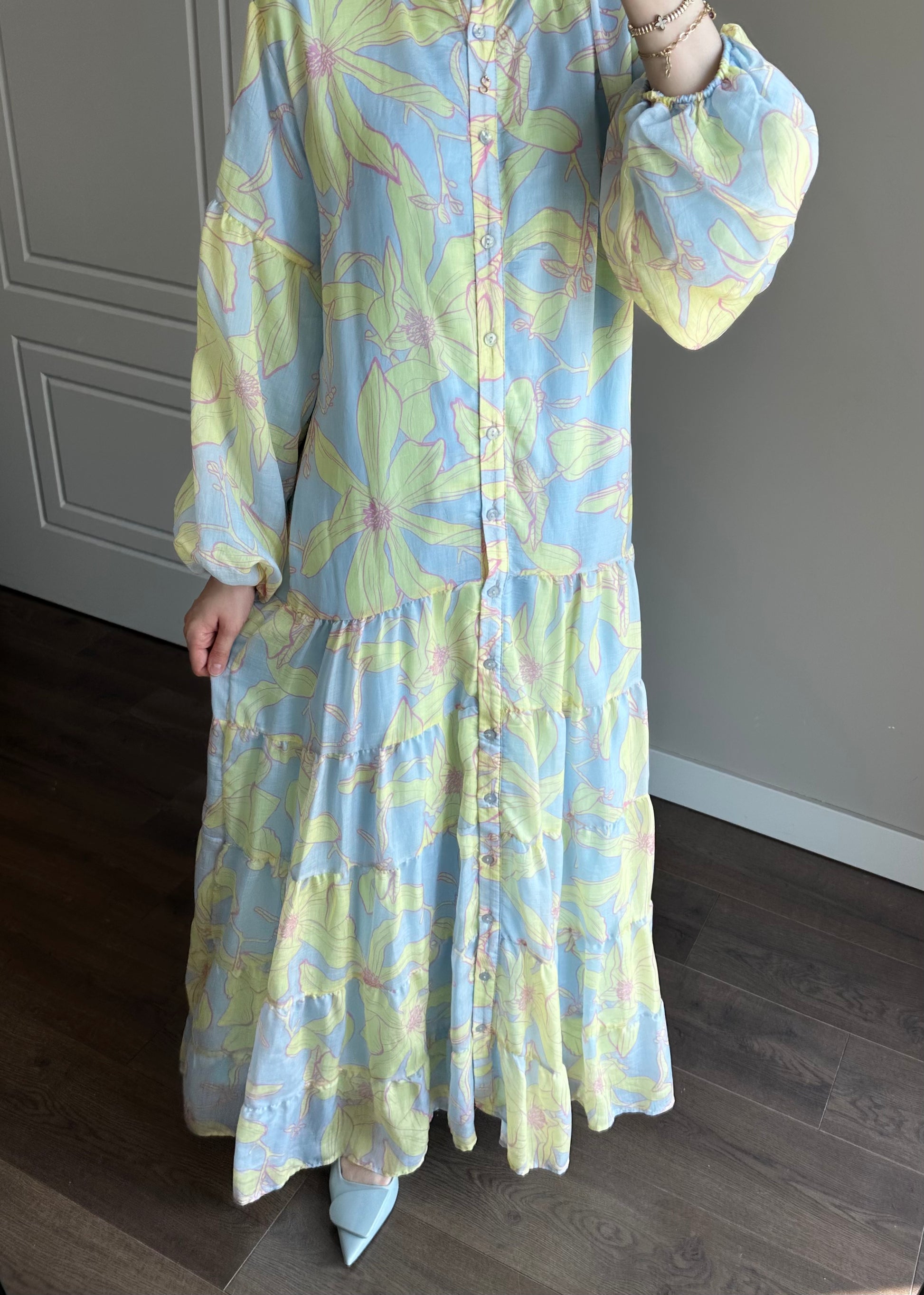 ÇİÇEK DESENLİ VUAL ELBİSE MAVİ