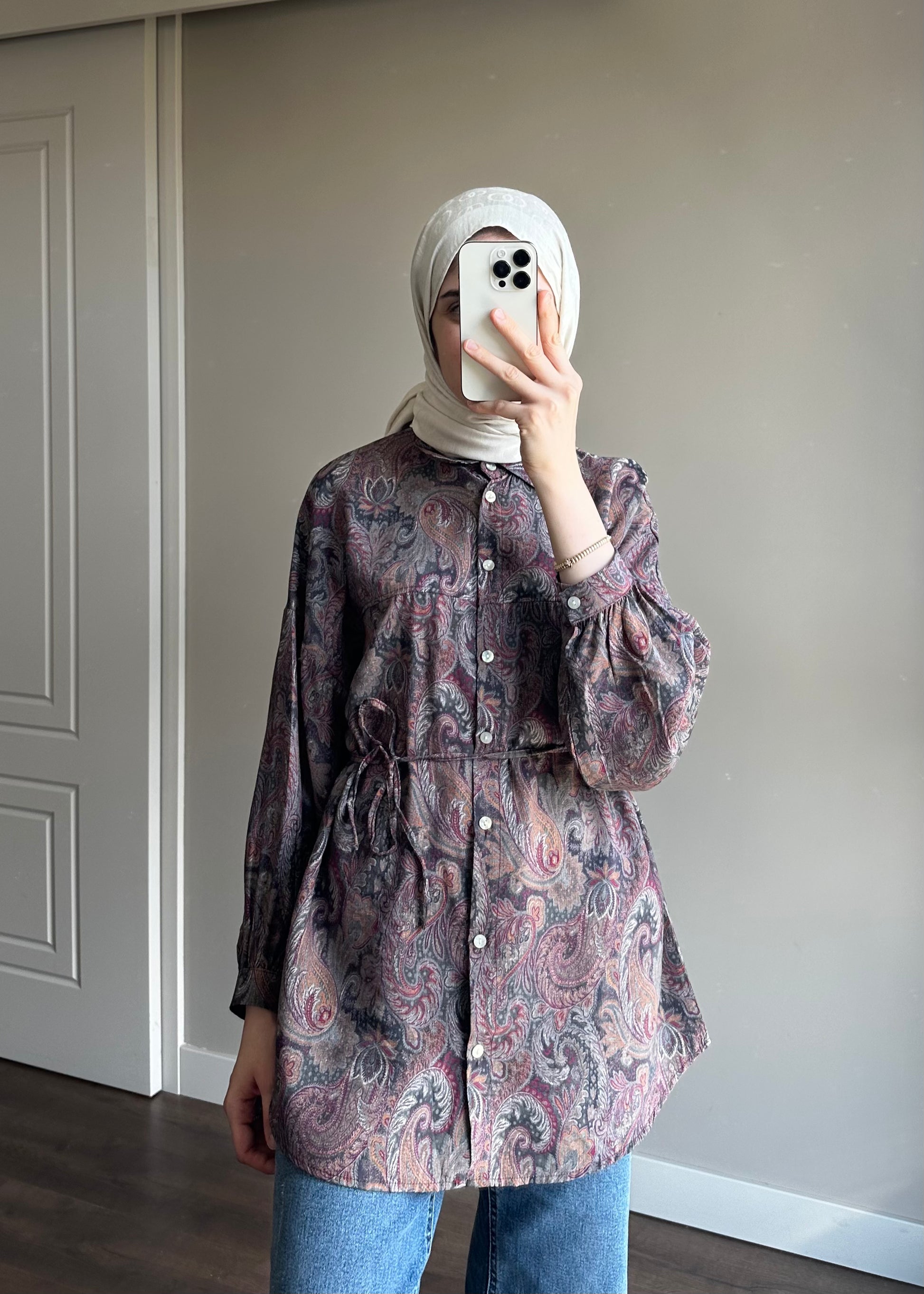 Yakalı , bağlamalı , etnik desenli , düşük omuzlu , lilyum kumaş gömlek.