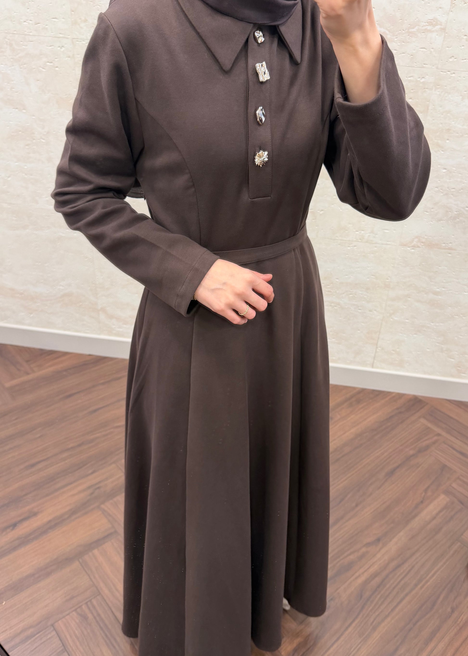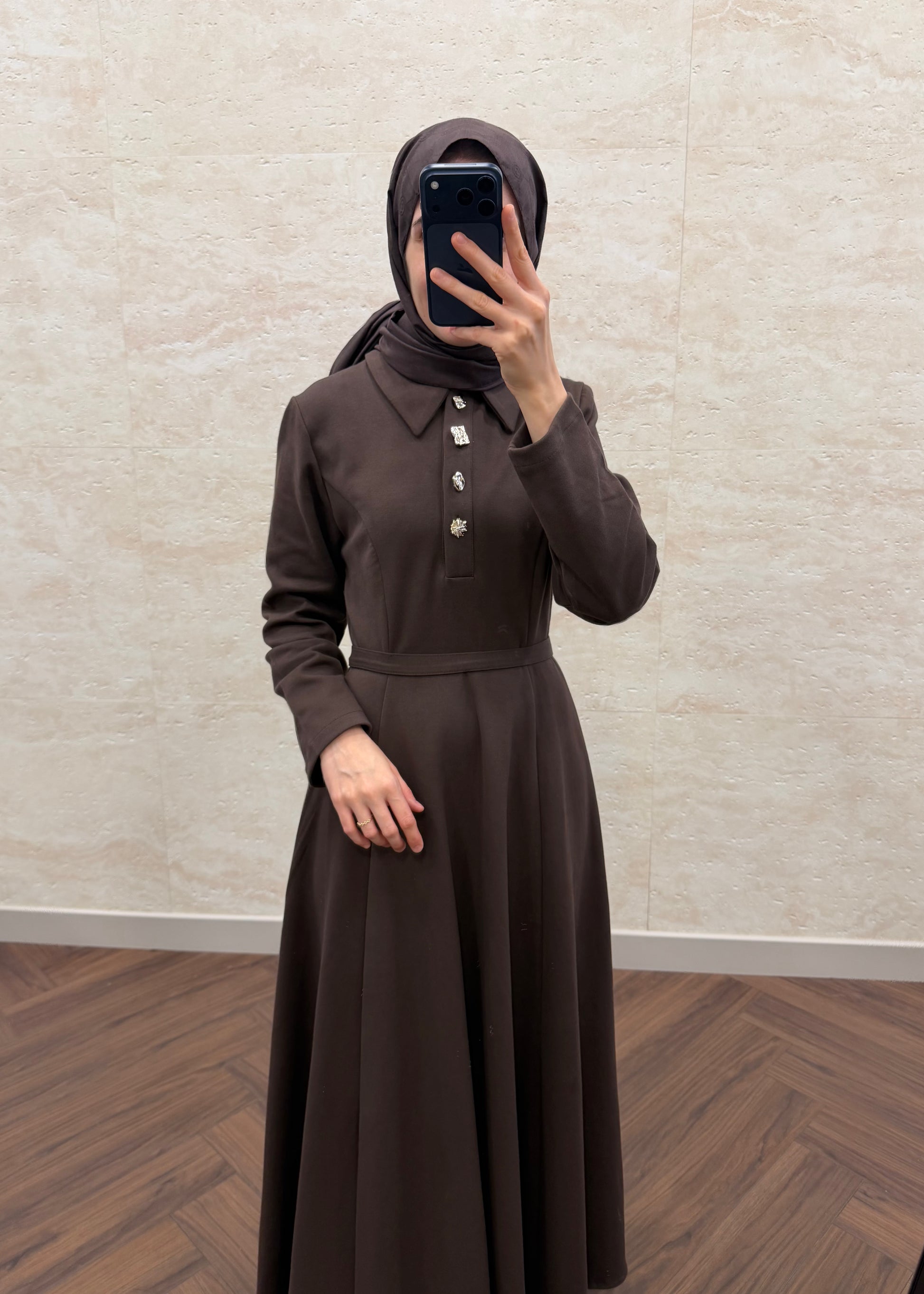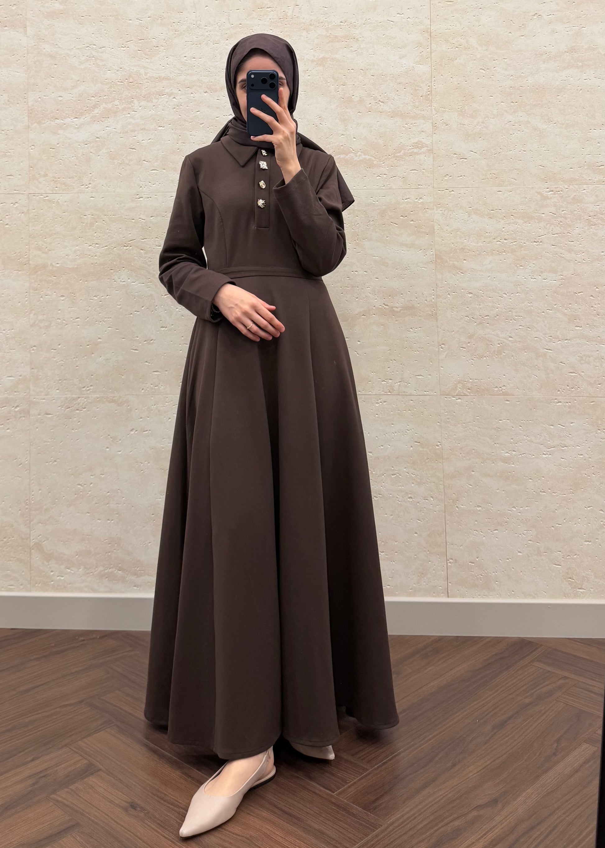 GOLD DÜĞME DETAY LİNDA ELBİSE KAHVE