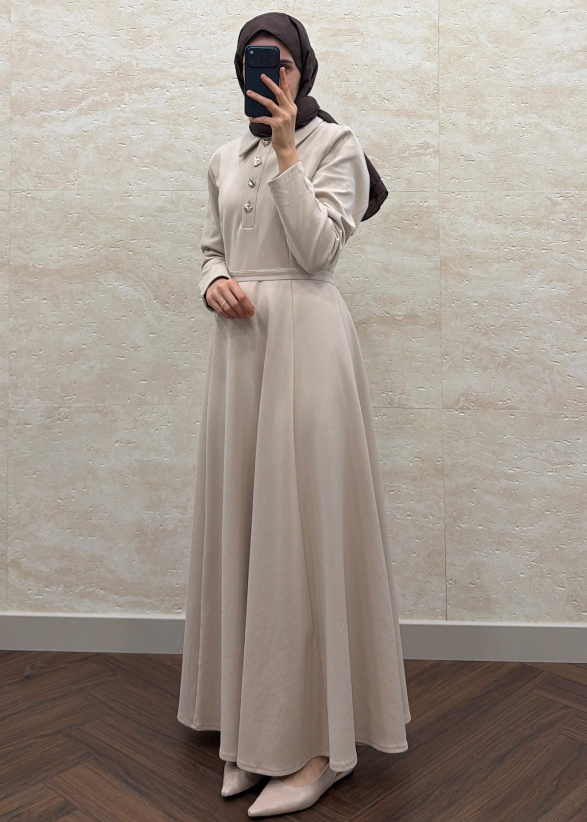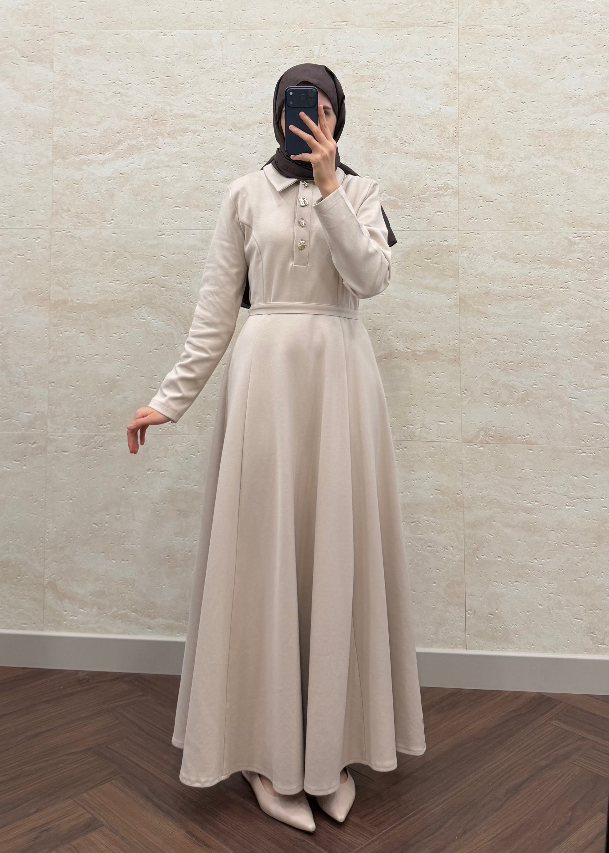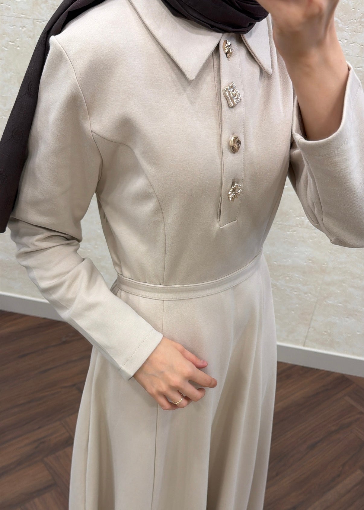 GOLD DÜĞME DETAY LİNDA ELBİSE TAŞ