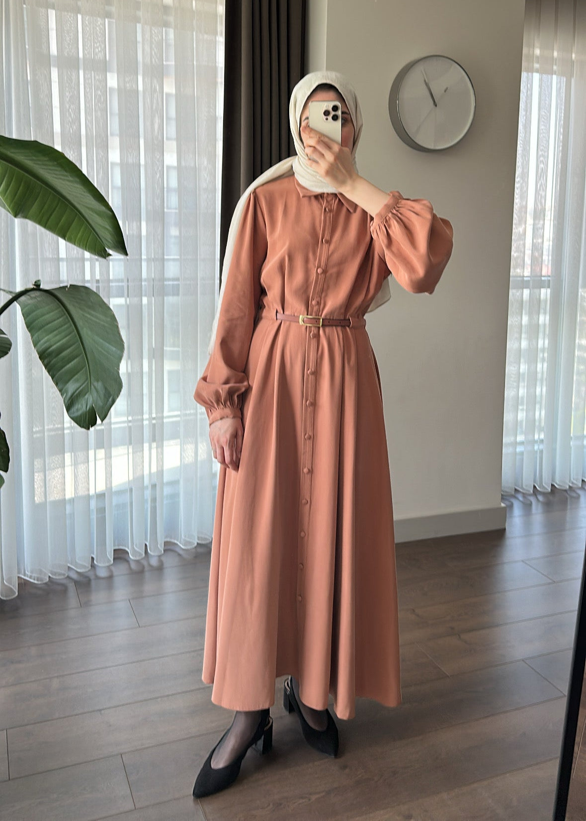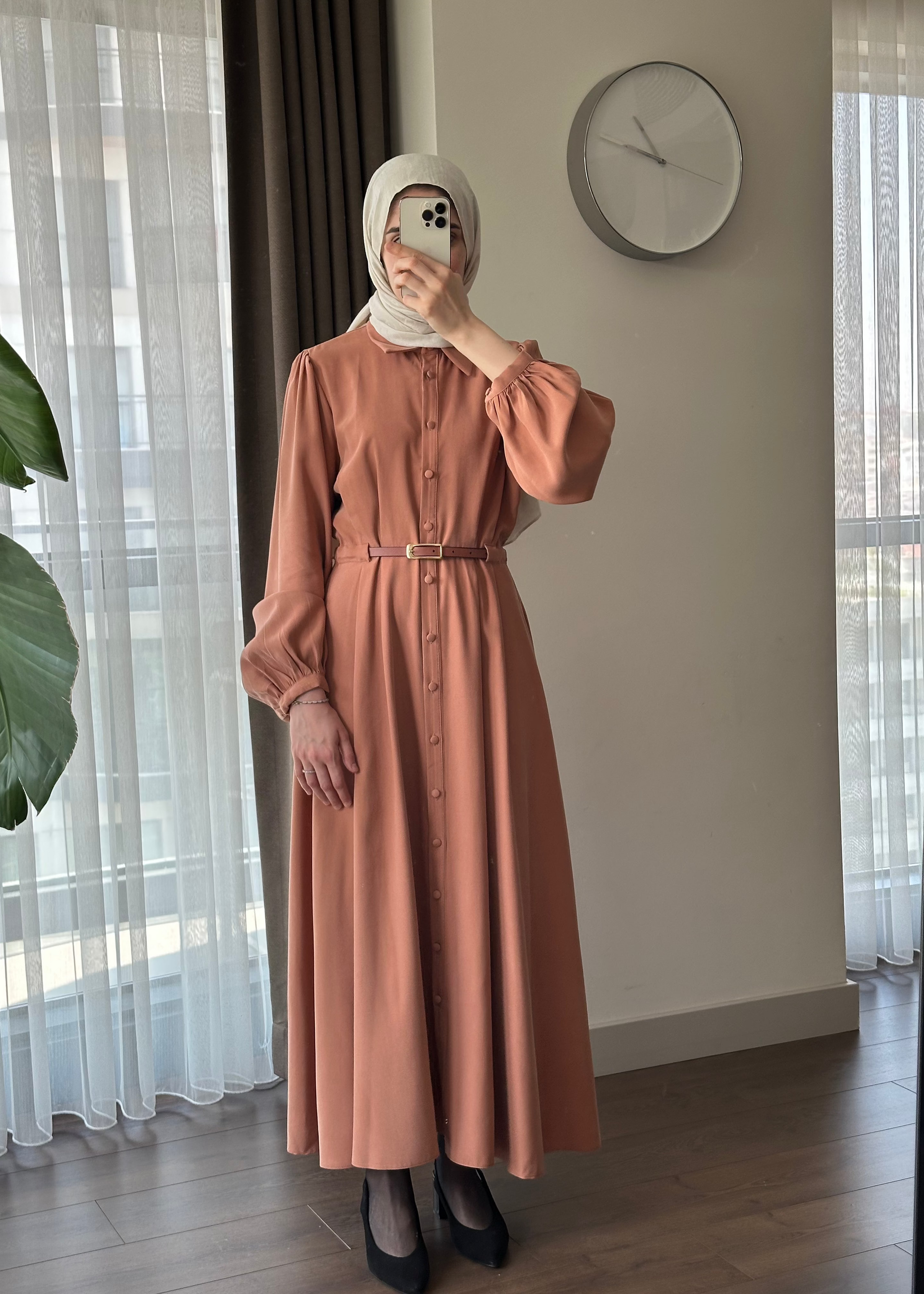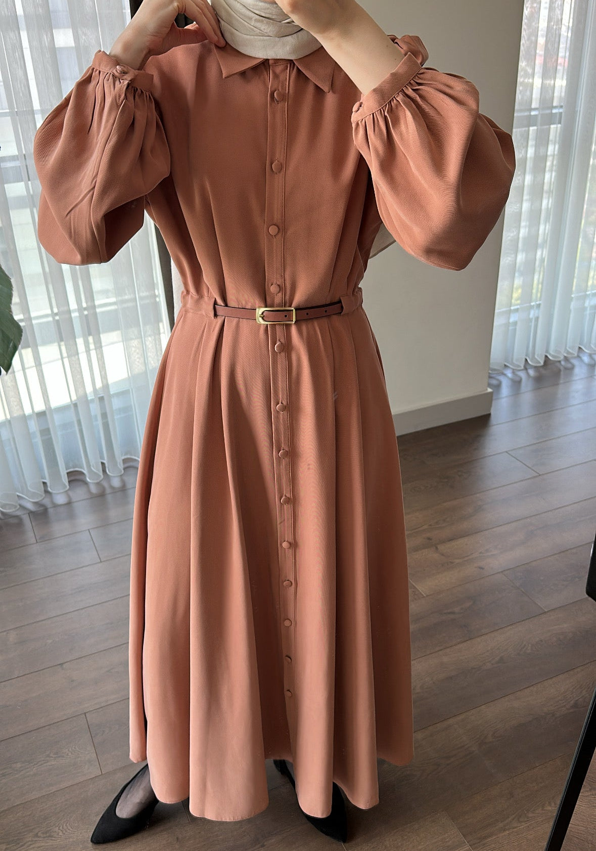Gömlek yakalı , kemerli , pileli , balon kollu , renginden düğmeli , salaş kalıp , modal kumaş ipeksi elbise.