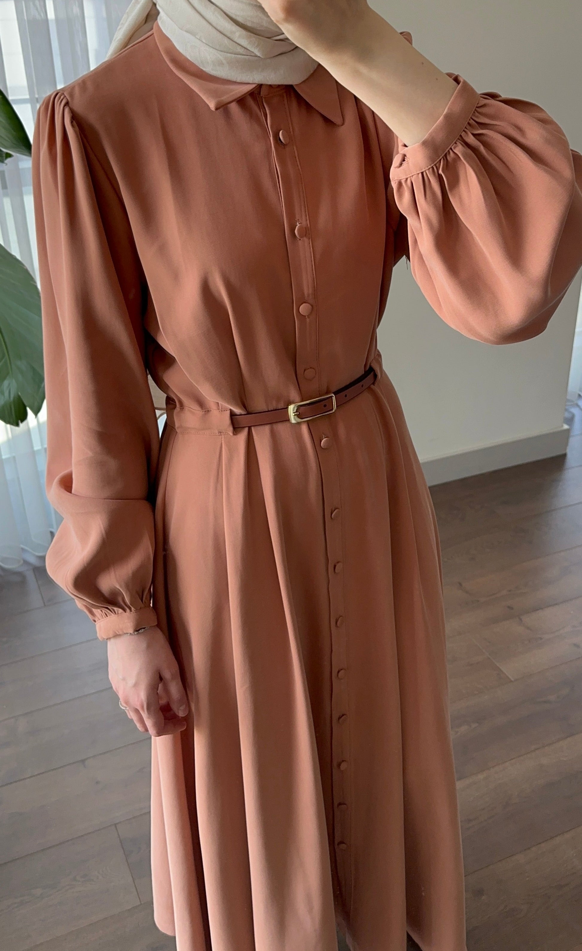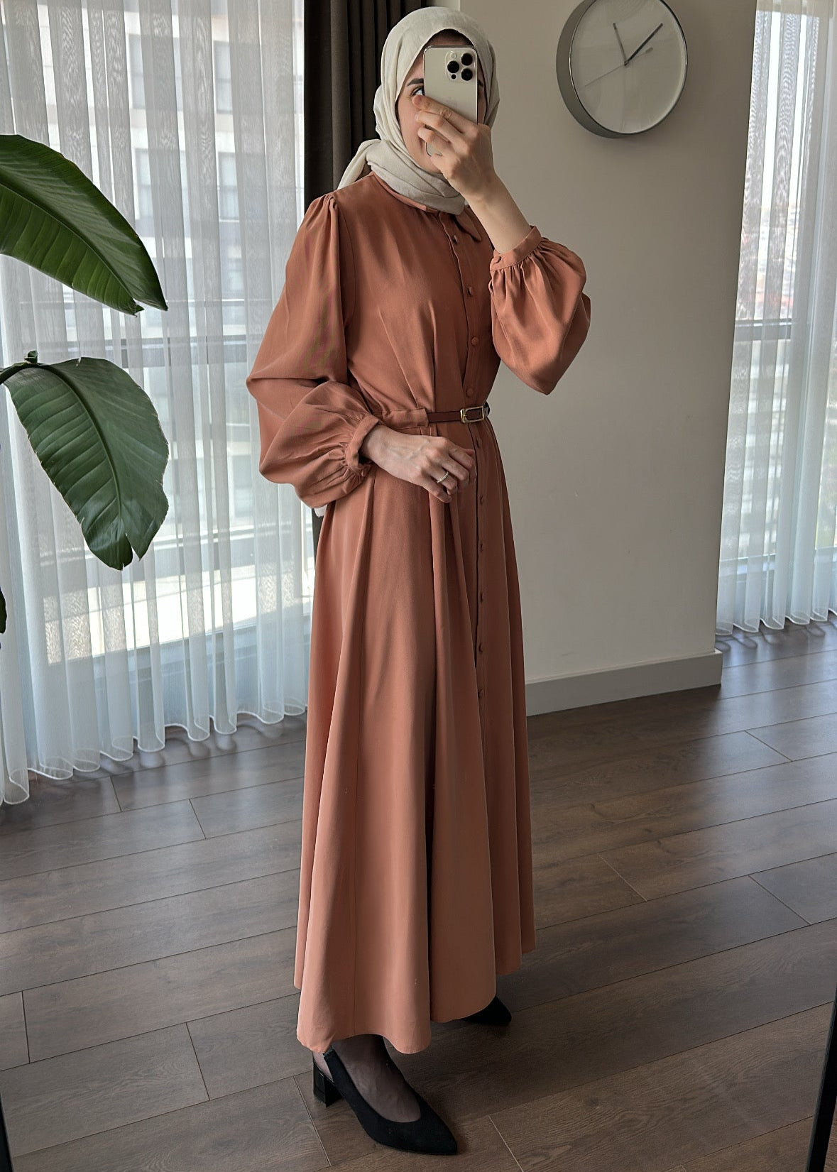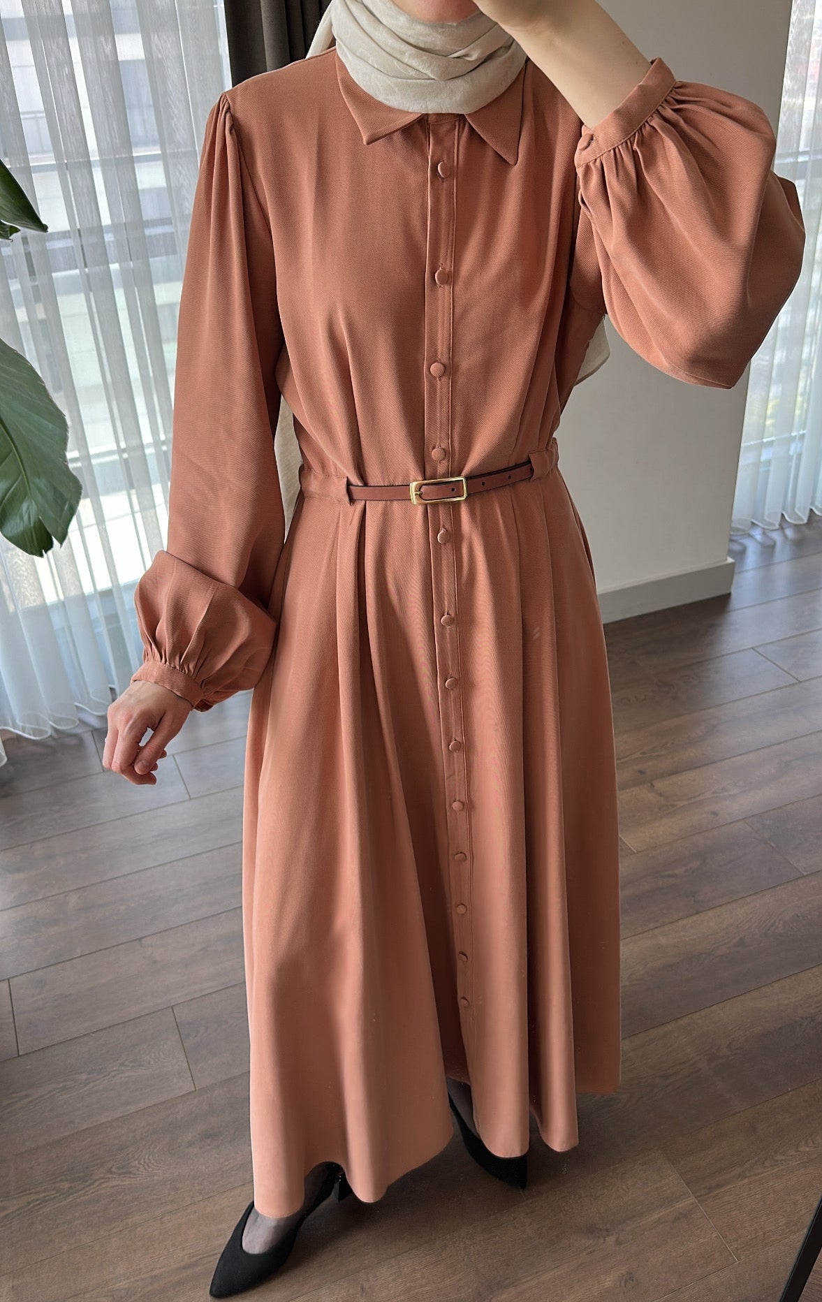Gömlek yakalı , kemerli , pileli , balon kollu , renginden düğmeli , salaş kalıp , modal kumaş ipeksi elbise.