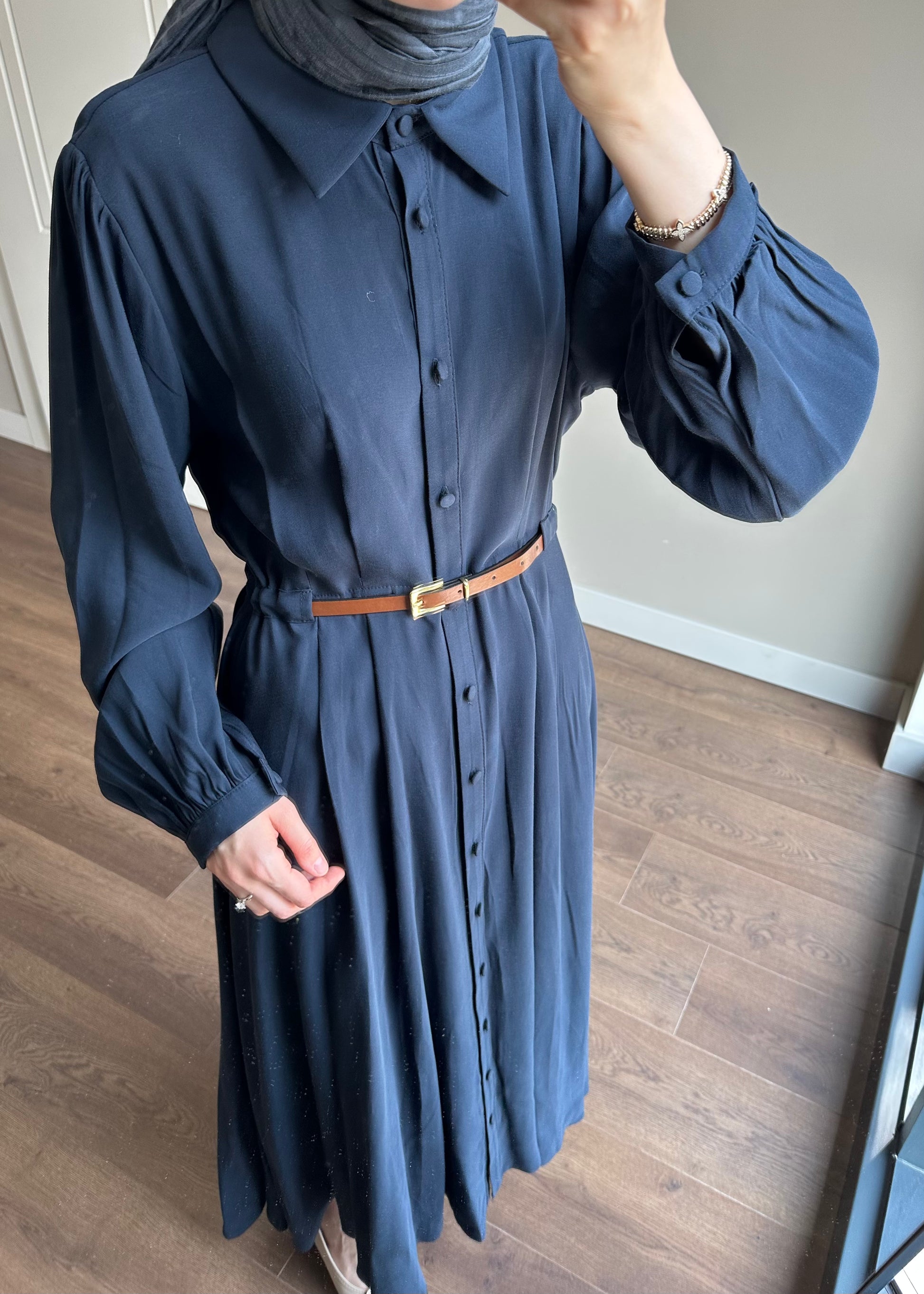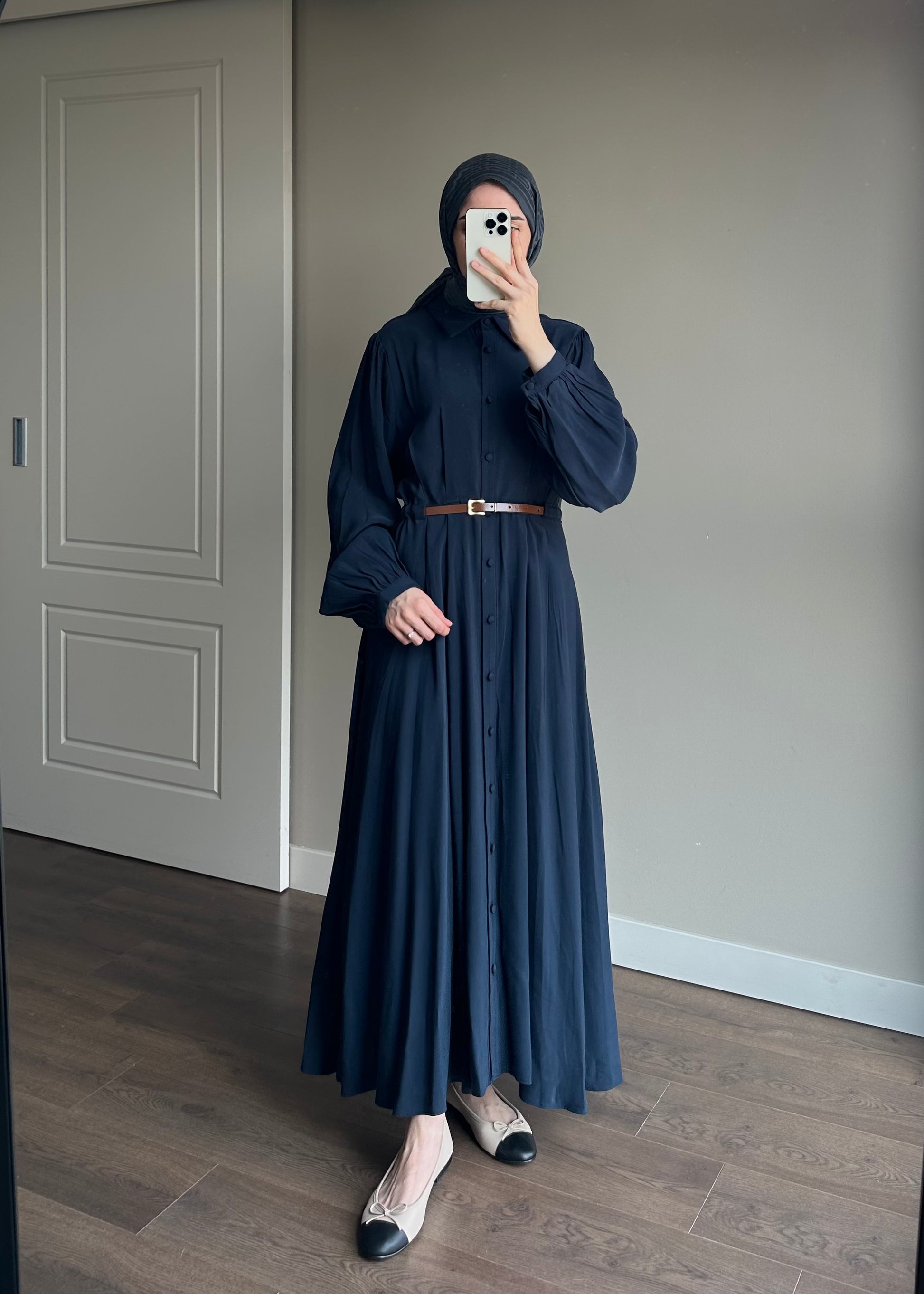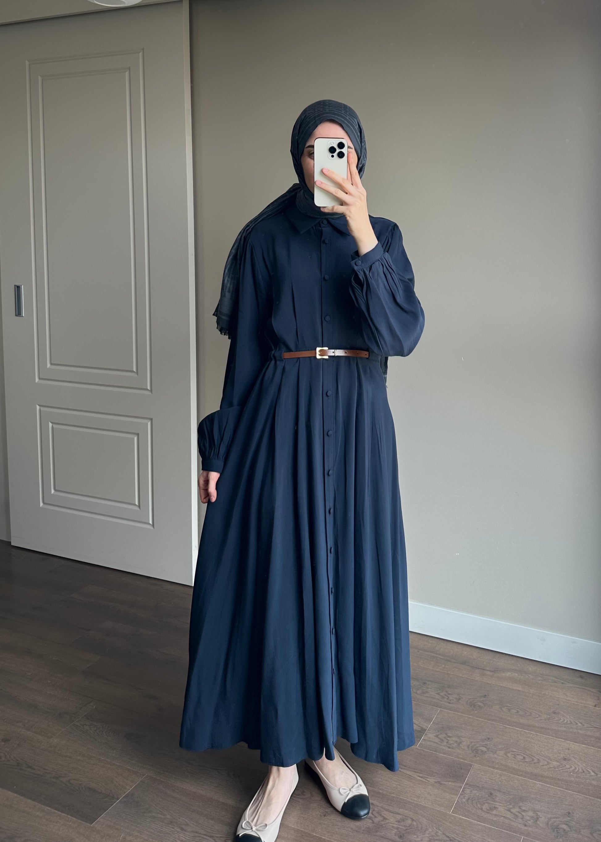 Gömlek yakalı , kemerli , pileli , balon kollu , renginden düğmeli , salaş kalıp , modal kumaş ipeksi elbise.