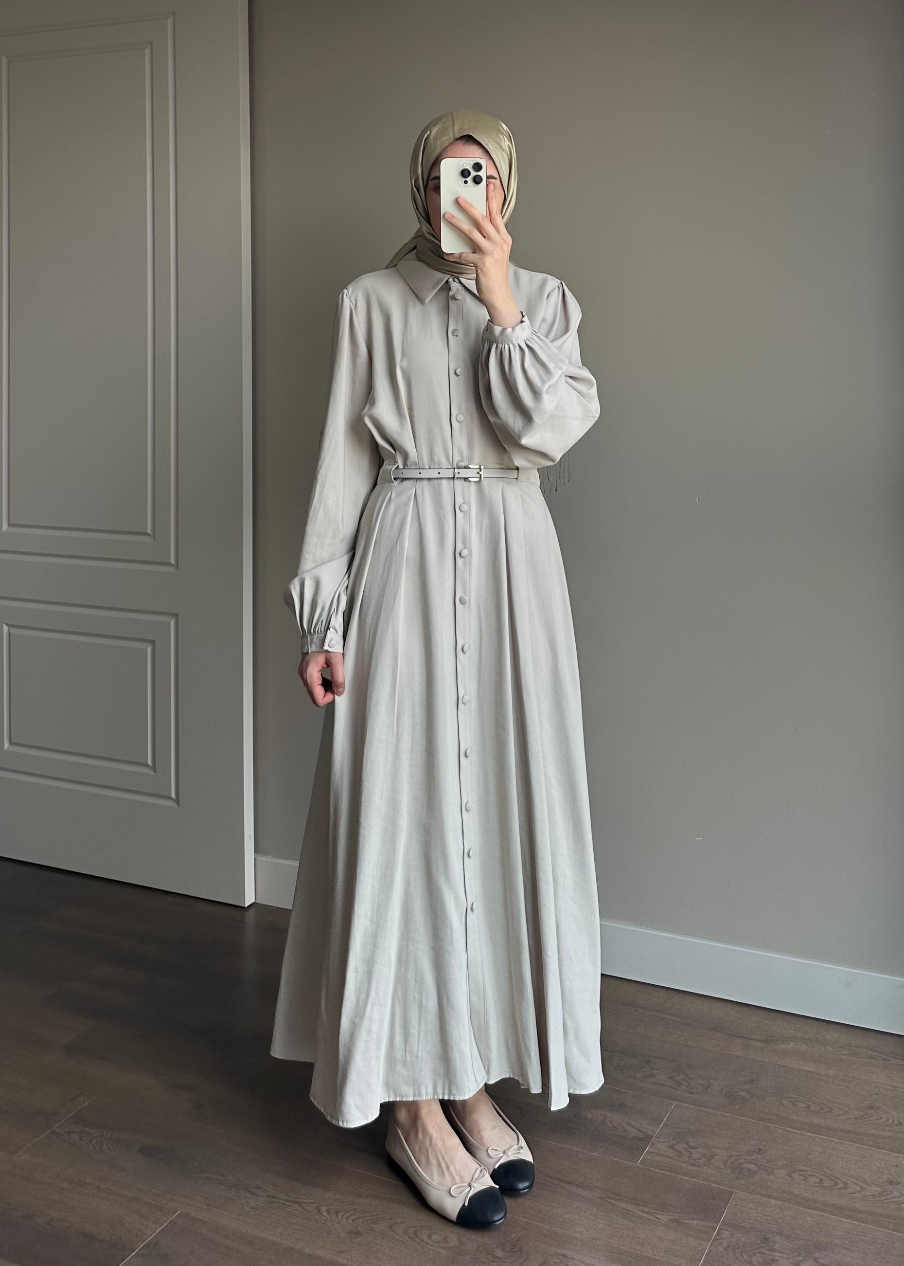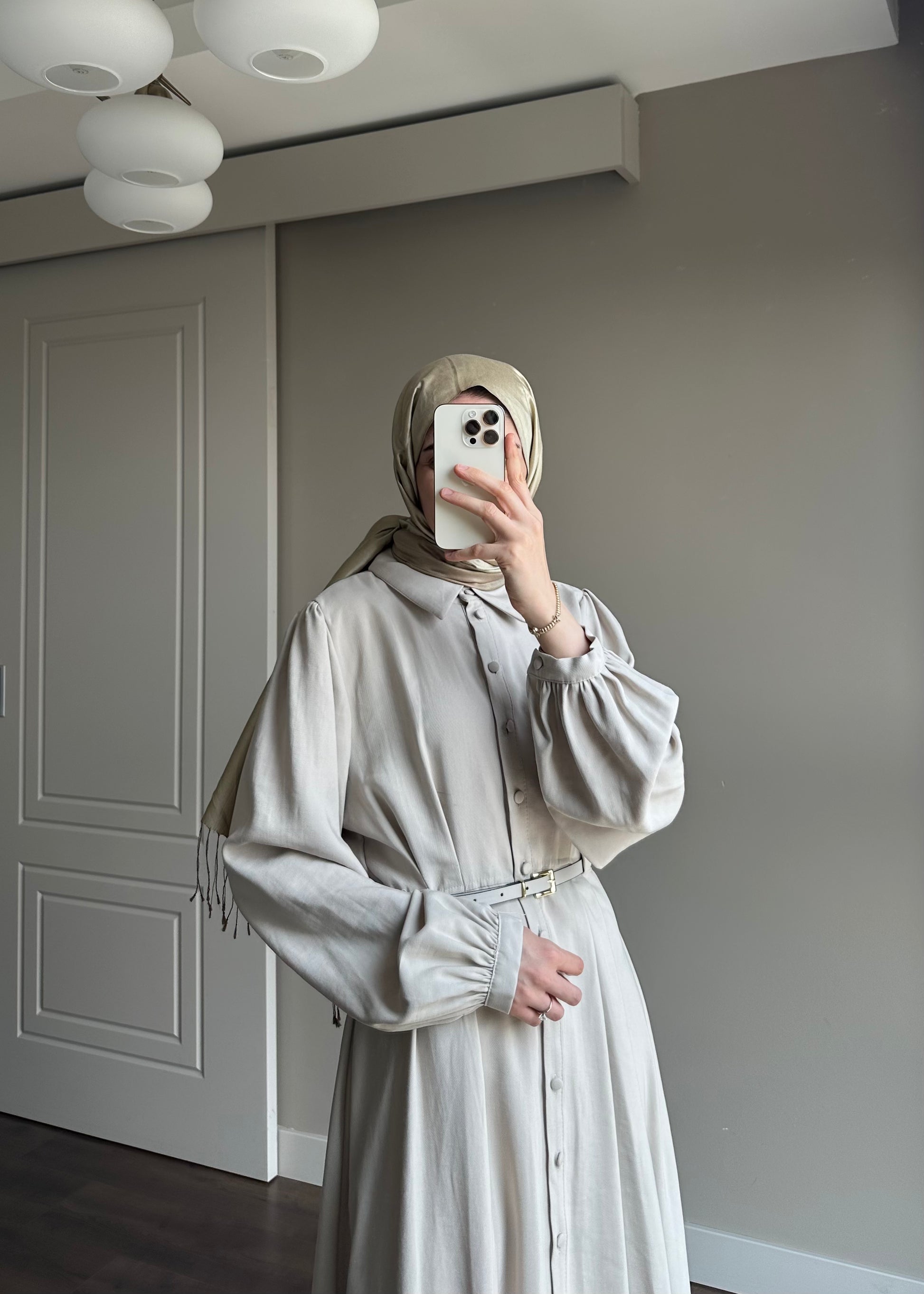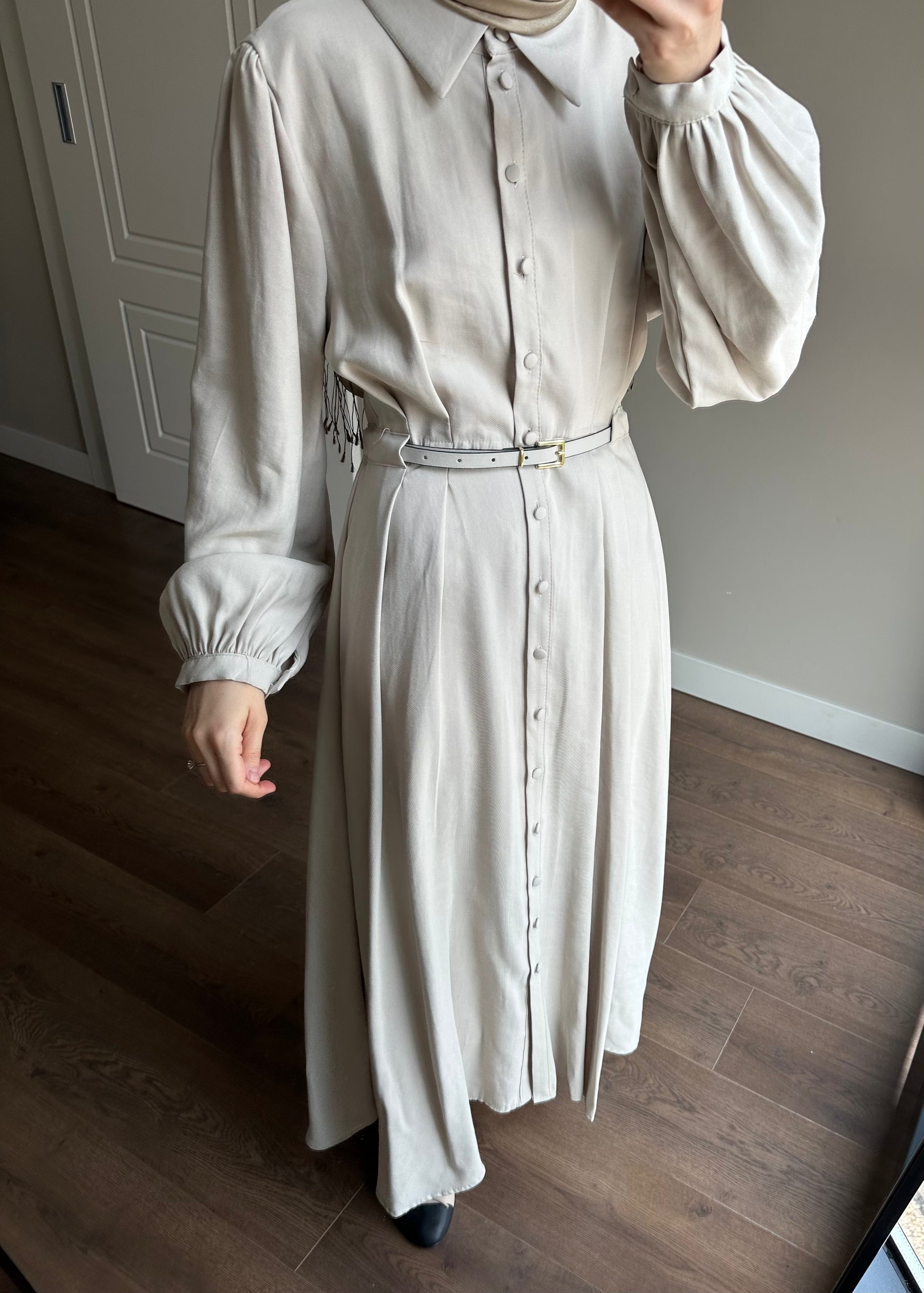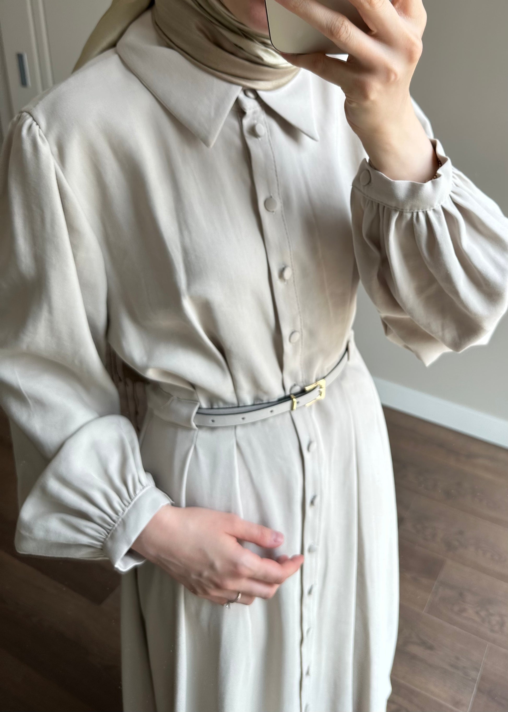 Gömlek yakalı , kemerli , pileli , balon kollu , renginden düğmeli , salaş kalıp , modal kumaş ipeksi elbise.