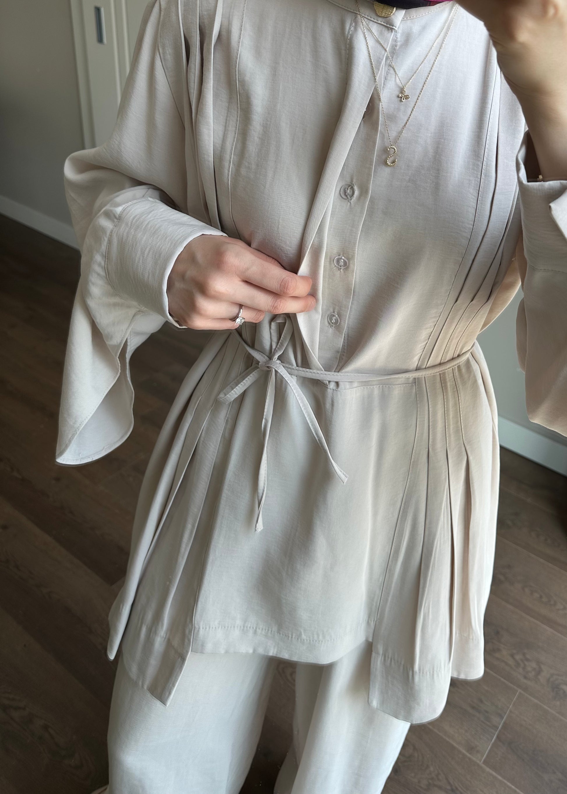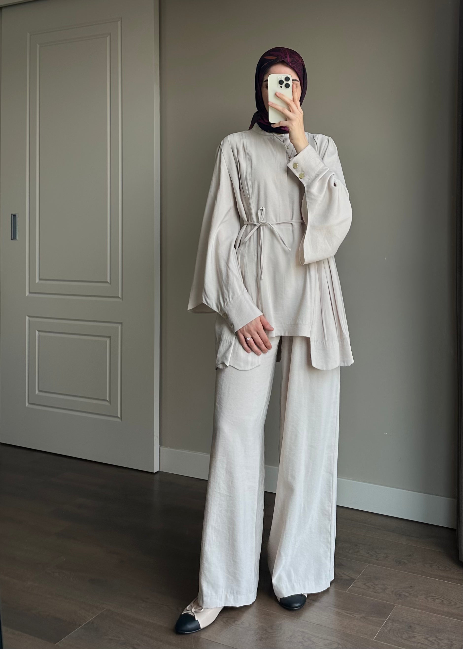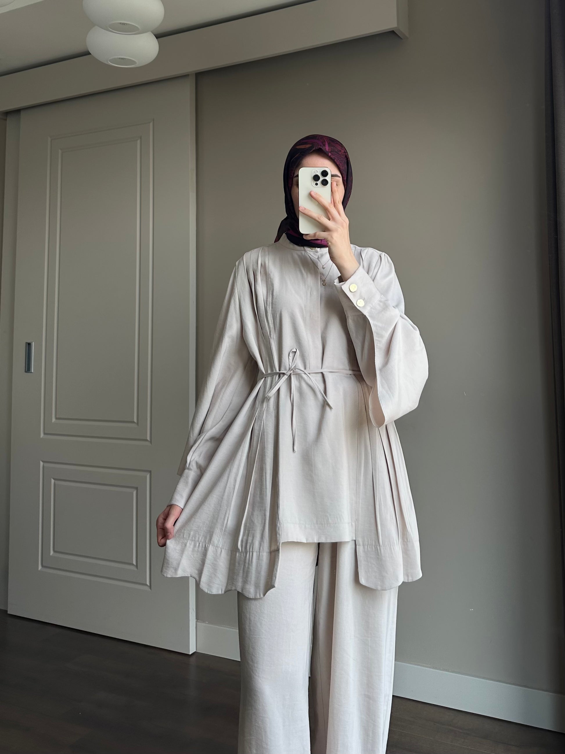 Nervür detaylı , kuşaklı , bol paça pantolonlu , kolları pelerin detaylı , modal kumaş ipeksi dokulu takım.