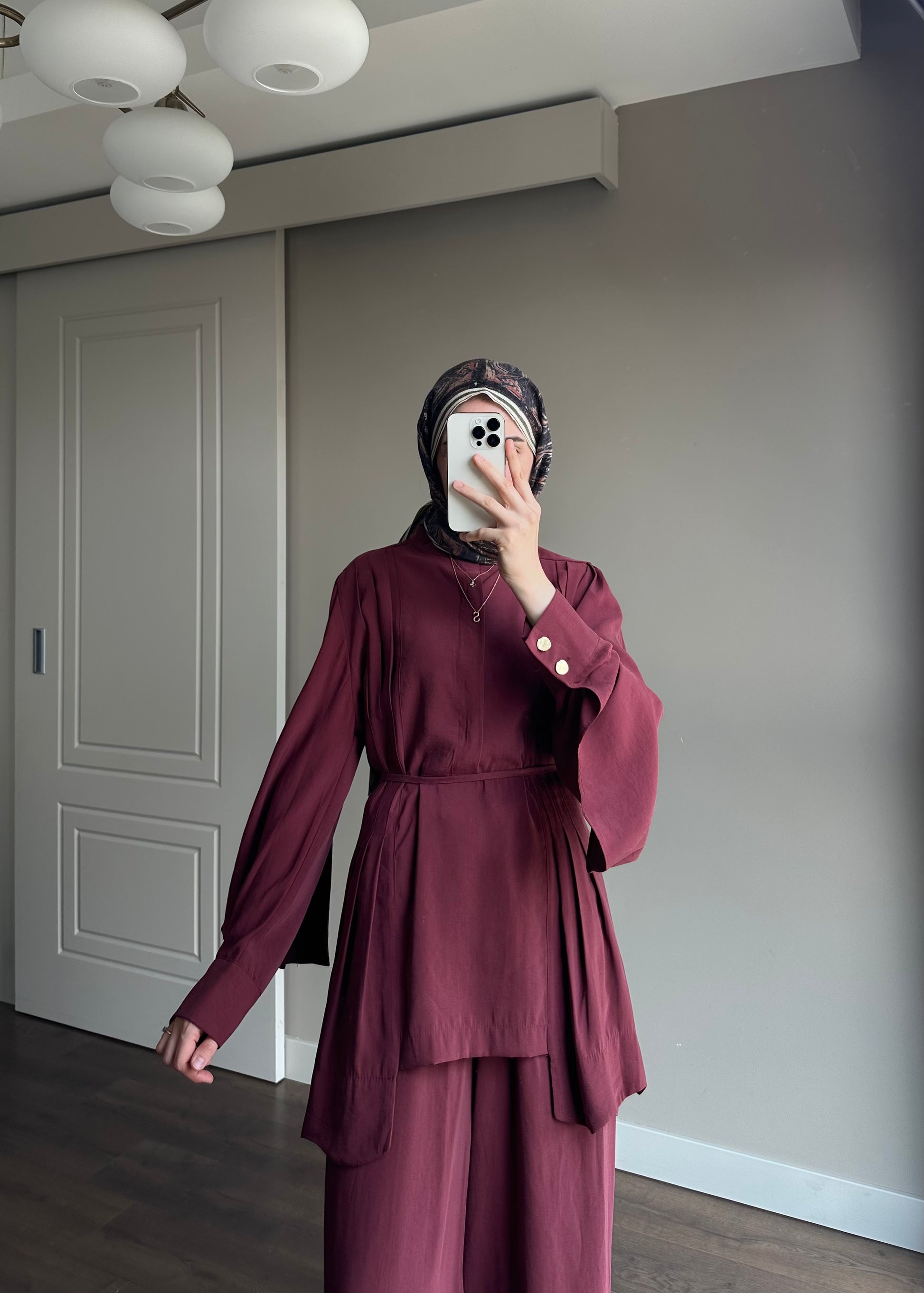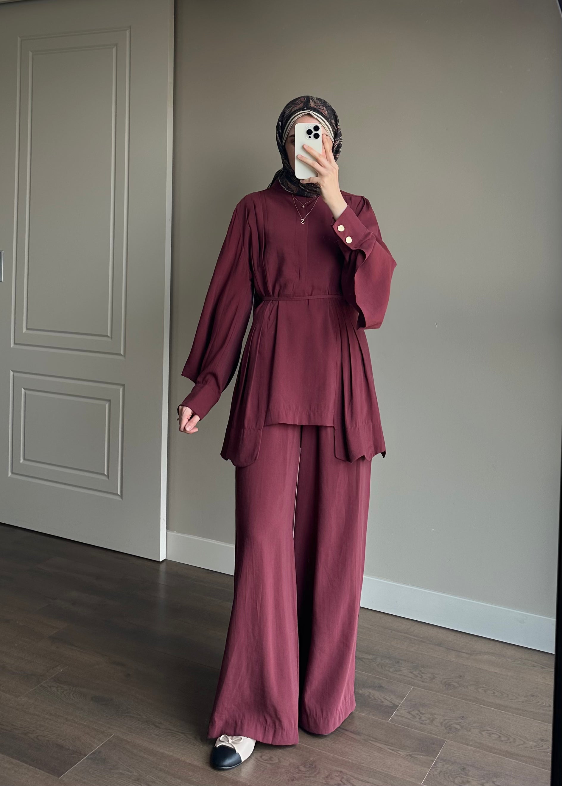 Nervür detaylı , kuşaklı , bol paça pantolonlu , kolları pelerin detaylı , modal kumaş ipeksi dokulu takım.