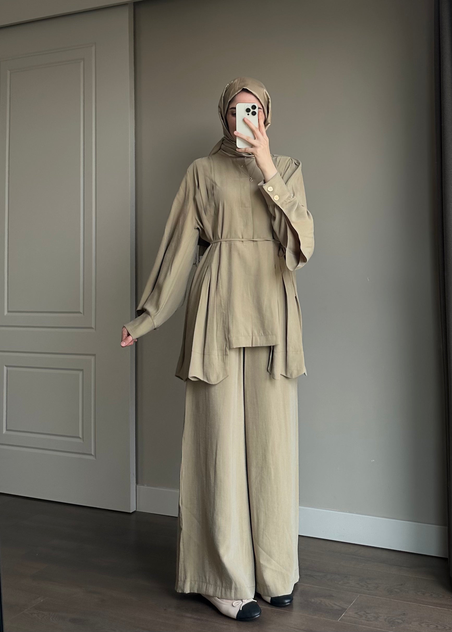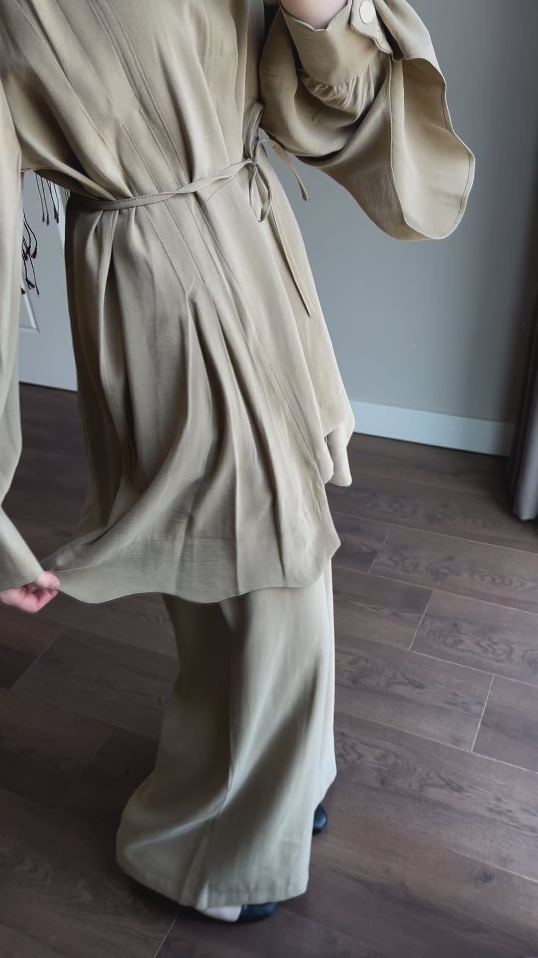 Nervür detaylı , kuşaklı , bol paça pantolonlu , kolları pelerin detaylı , modal kumaş ipeksi dokulu takım.