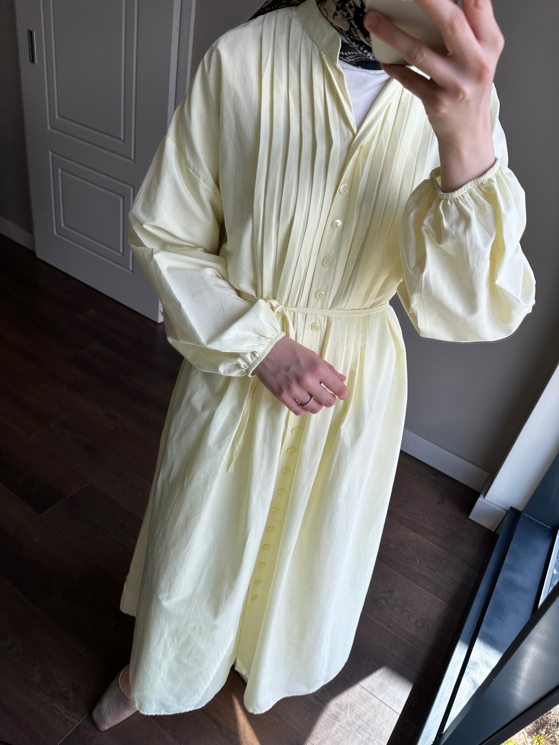 Hakim yakalı , seyyar kuşaklı , nervür detaylı , boydan düğmeli , kolları lastikli , oversize kalıp , poplin kumaş elbise.