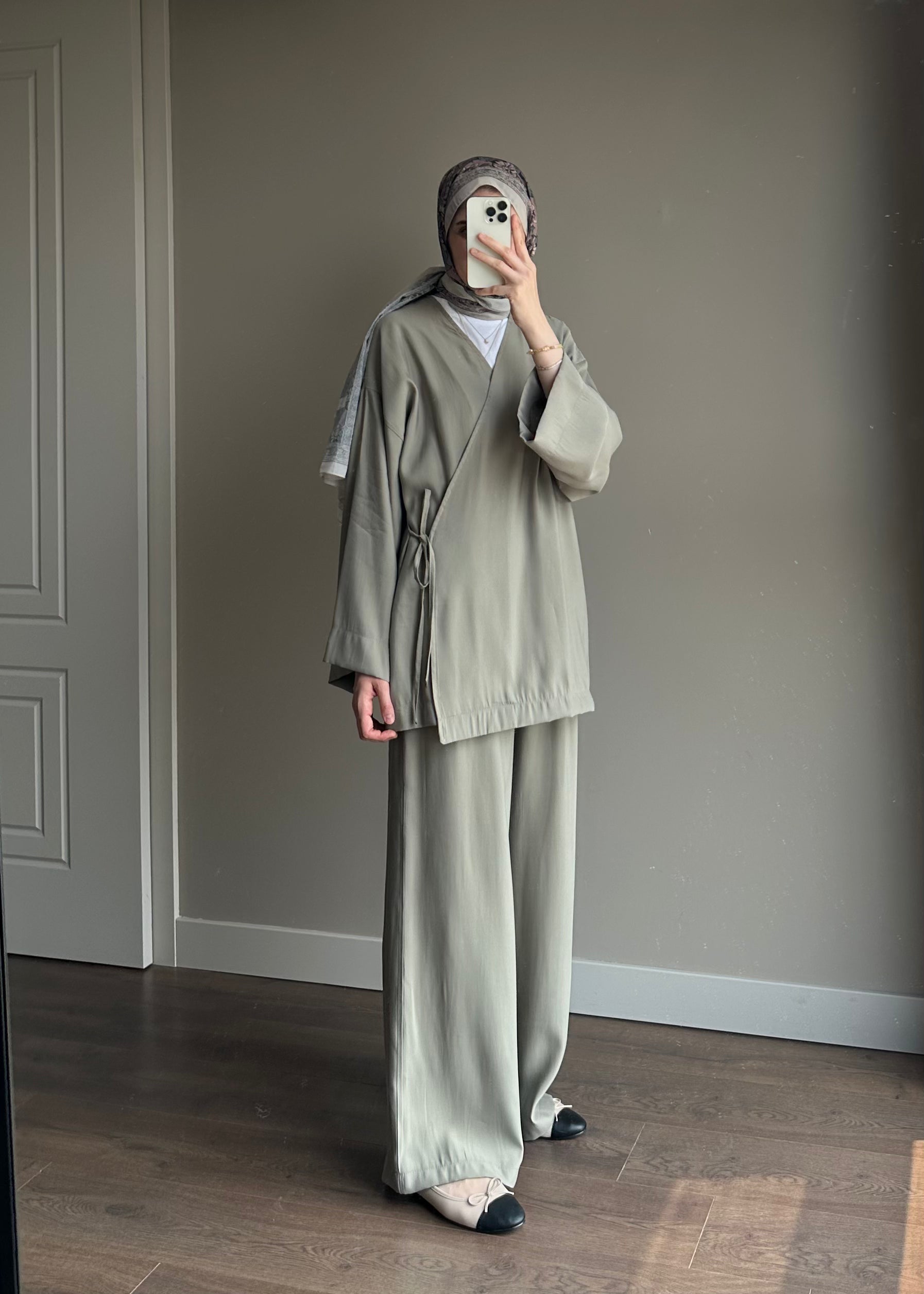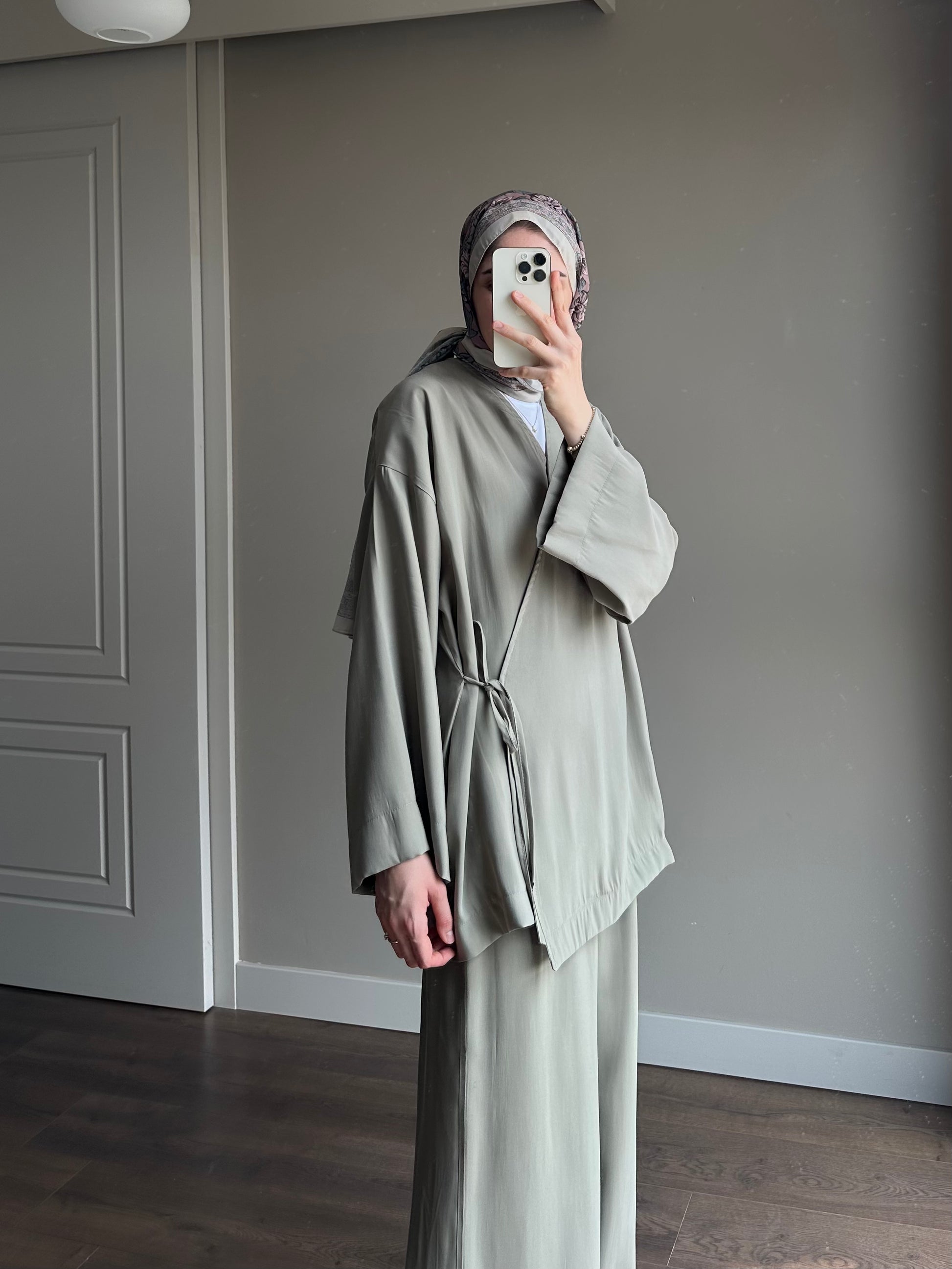 Kimonolu , bağlamalı , bol paça pantolonlu , salaş kalıp , tensel kumaş ipeksi dokulu takım.