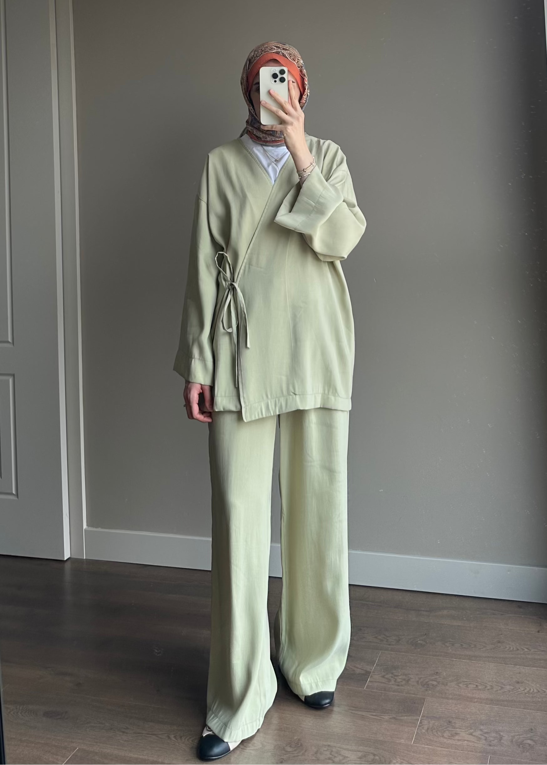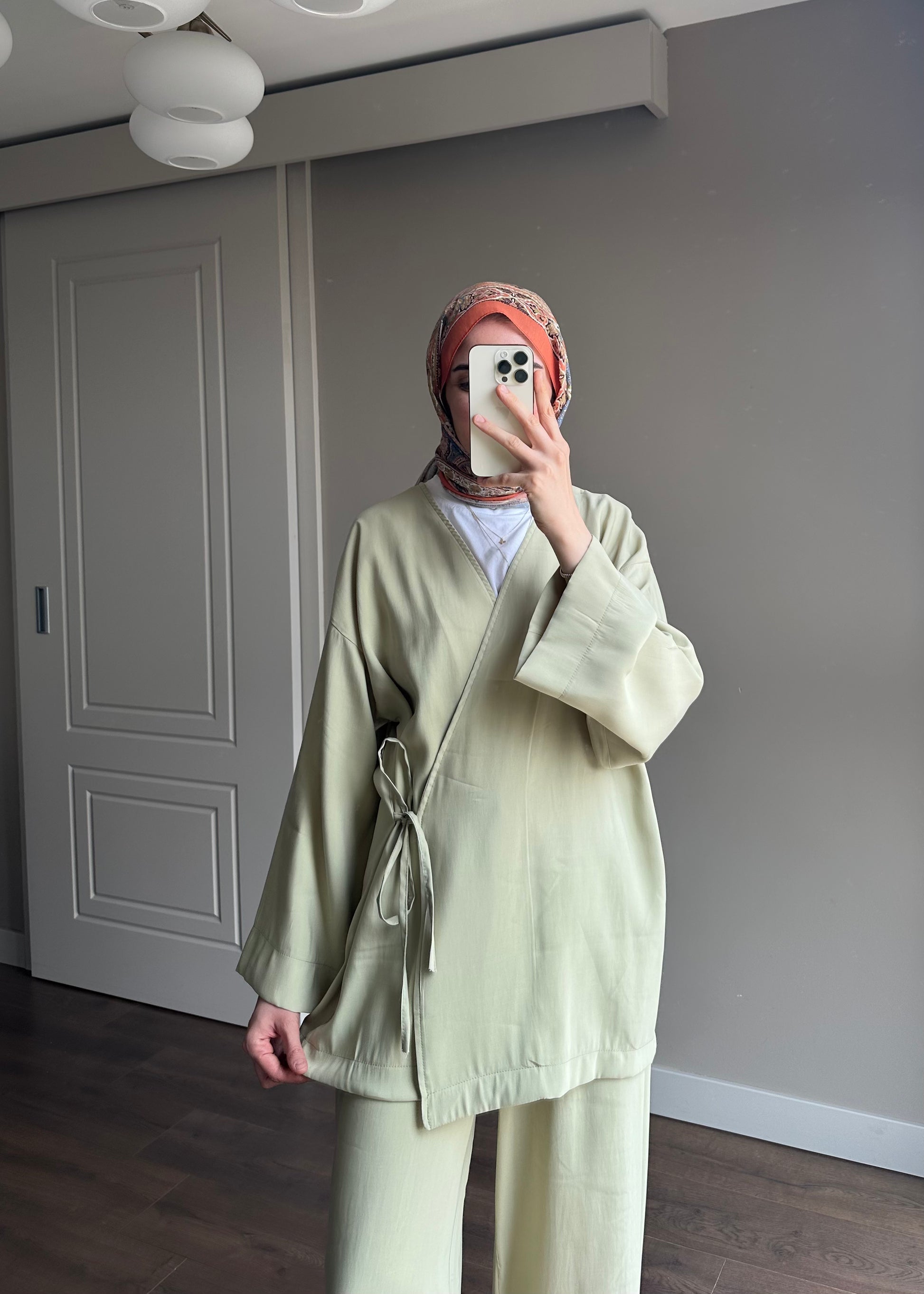 Kimonolu , bağlamalı , bol paça pantolonlu , salaş kalıp , tensel kumaş ipeksi dokulu takım.